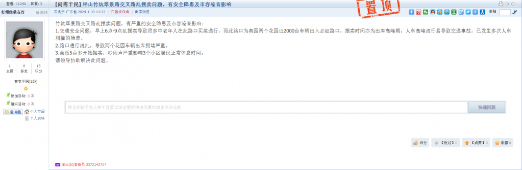 4、帖文《坪山竹坑翠景路交叉路乱摆卖问题,有安全隐患及市容噪音影响》
