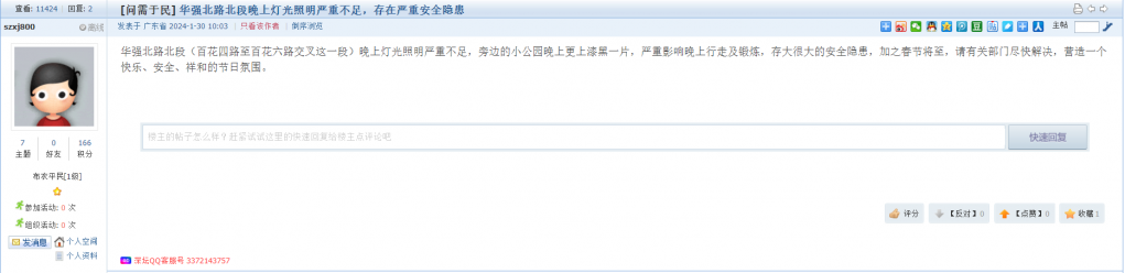 3、帖文《华强北路北段晚上灯光照明严重不足,存在严重安全隐患》