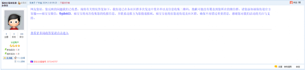 据统计,2024年2月5日-2月18日,网友在深圳论坛发布问政类帖文共8篇,得到相关单位正式回应的帖文数为3篇,回应最快的部门为福田区福保街道办事处。