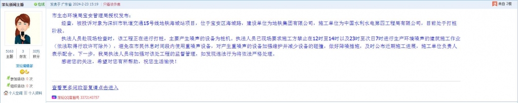 2、帖文《15号线海城站施工噪音让坪洲新村小区居民苦不堪言》