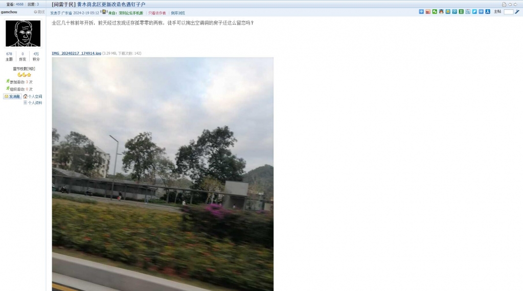 1、帖文《黄木岗北区更新改造也遇钉子户》
