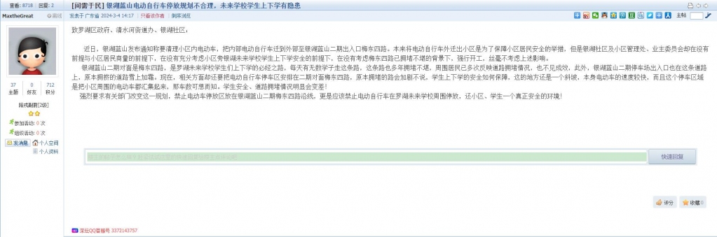 1、帖文《银湖蓝山电动自行车停放规划不合理,未来学校学生上下学有隐患》