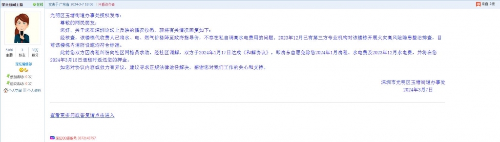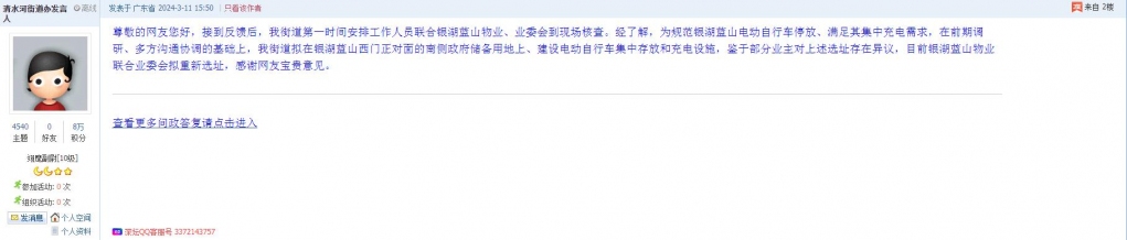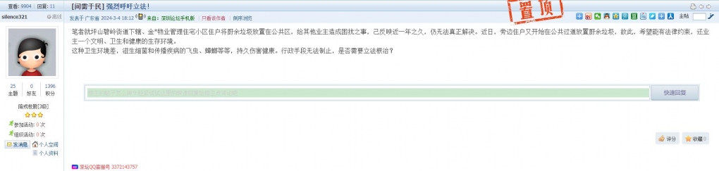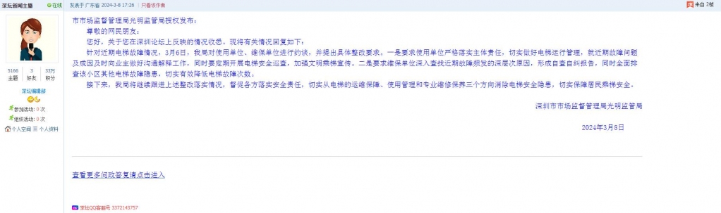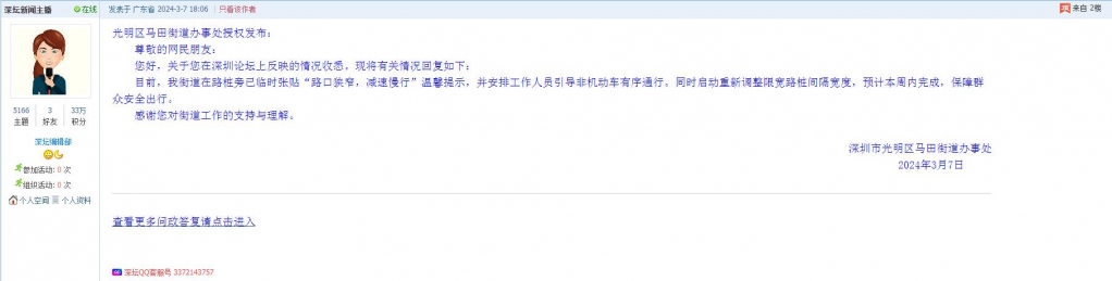 各职能单位如需对网友反映的问题进行回应,可在深圳论坛注册官方账号并通过认证,回帖进行回应。