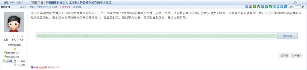 3、帖文《光明围岸商业街入口新设立的路桩完成交通安全隐患》