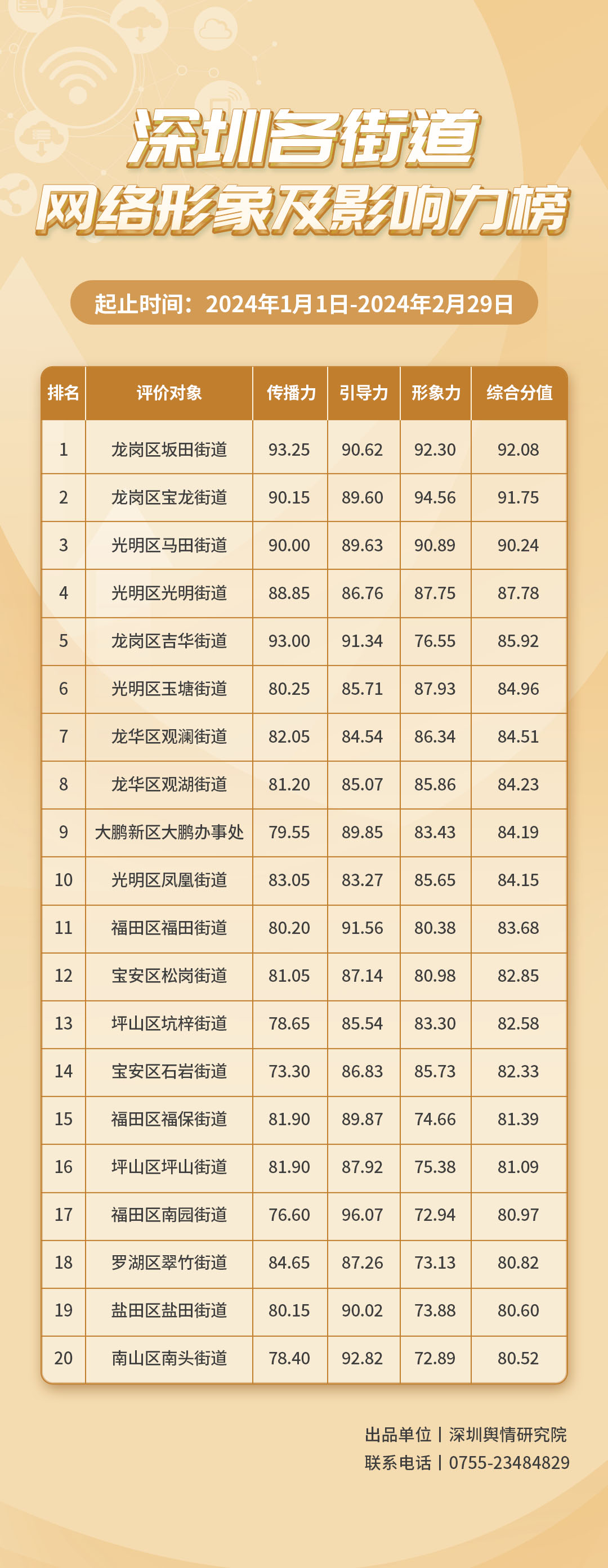 深圳新闻网3月21日讯(记者 王亚男 实习生 上官新昕) 2024年3月20日,深圳舆情研究院编制推出《深圳各街道网络形象及影响力榜》(1-2月期),公布深圳市20个网络形象及影响力建设成效靠前的街道,并指出深入了解各街道的网络形象构建状况和社会影响,有助于推动街道治理“提质增效”,增加城市高质量发展动能。