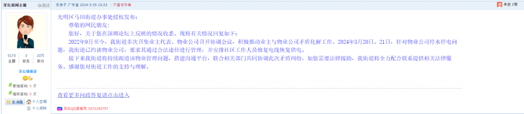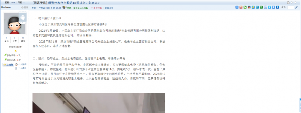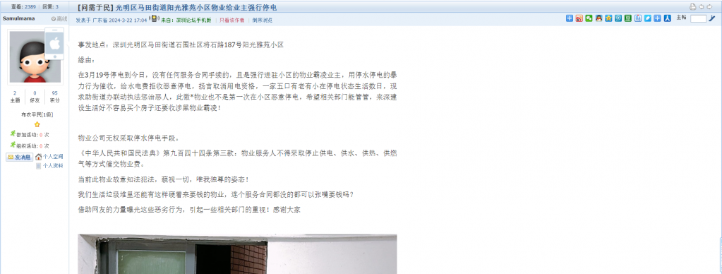 6、帖文《光明区马田街道阳光雅苑小区物业给业主强行停电》