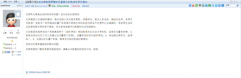 5、帖文《对光明街道翠湖社区荔园小区机动车停车建议》
