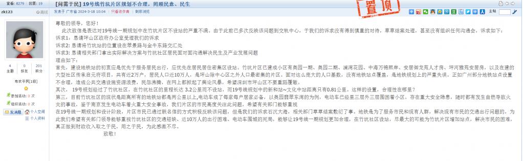 2、帖文《19号线竹坑片区规划不合理,罔顾民意、民生》