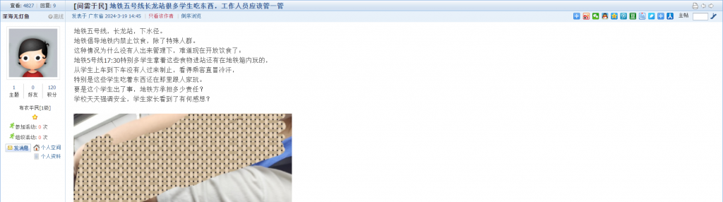 10、帖文《地铁五号线长龙站很多学生吃东西,工作人员应该管一管》