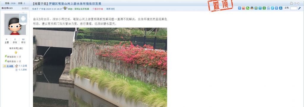8、帖文《罗湖区笔架山河上游水体环境依旧发黑》
