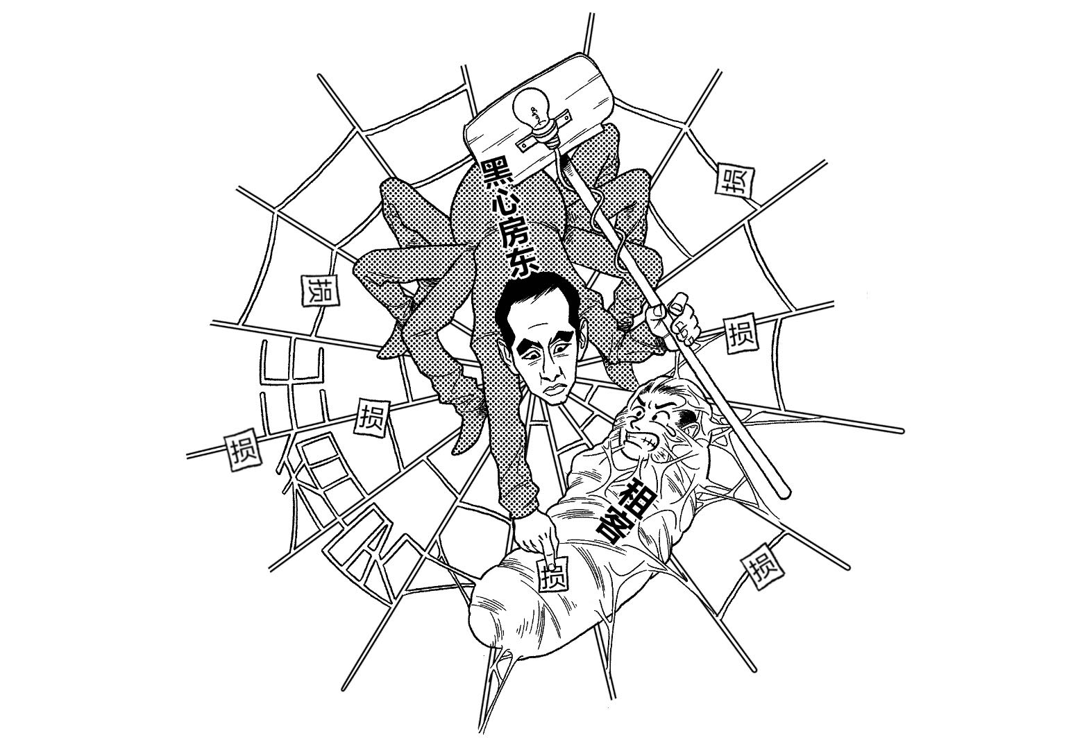 黑心房东套路深,验房定损自提灯。克扣押金赔损耗,吃干抹净租房人。