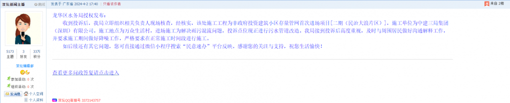 收到投诉后,我局立即组织相关负责人现场核查,经核实,该处施工工程为非政府投资建筑小区存量管网首次进场项目[二期(民治大浪片区)],施工单位为中建三局集团(深圳)有限公司。施工地点为万众生活村,进场施工为解决雨污混流问题,投诉点位现正进行污水管道改造。我局接到投诉后高度重视,及时与周围居民做好沟通解释工作,并要求施工期间做好降噪工作,严格要求在正常施工时间段进行施工。