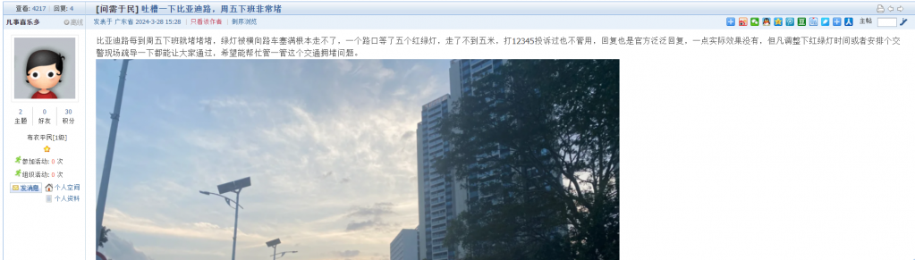 4、帖文《吐槽一下比亚迪路,周五下班非常堵》