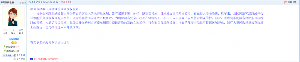 同时,考虑到市民游客对此条登山线路的喜爱,为满足市民需求,我处已开展梧桐山南路至蝴蝶谷路段建设的发改立项工作,待全面完善道路设施,彻底消除安全隐患后将该区域开放,请广大市民选择正规登山道上山游玩,切勿擅自进入未开放区域。