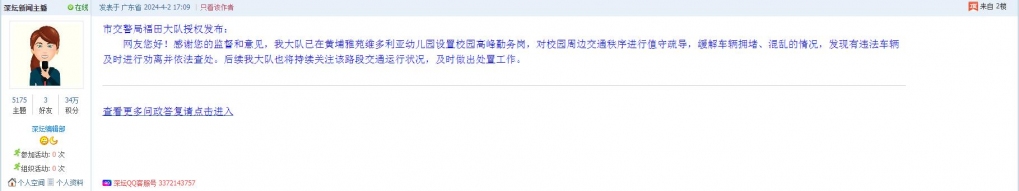 4、帖文《【福田报料】建议方案:福中路黄埔雅苑路段常年因为幼儿园接送问题造成交通堵塞》