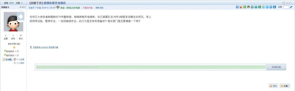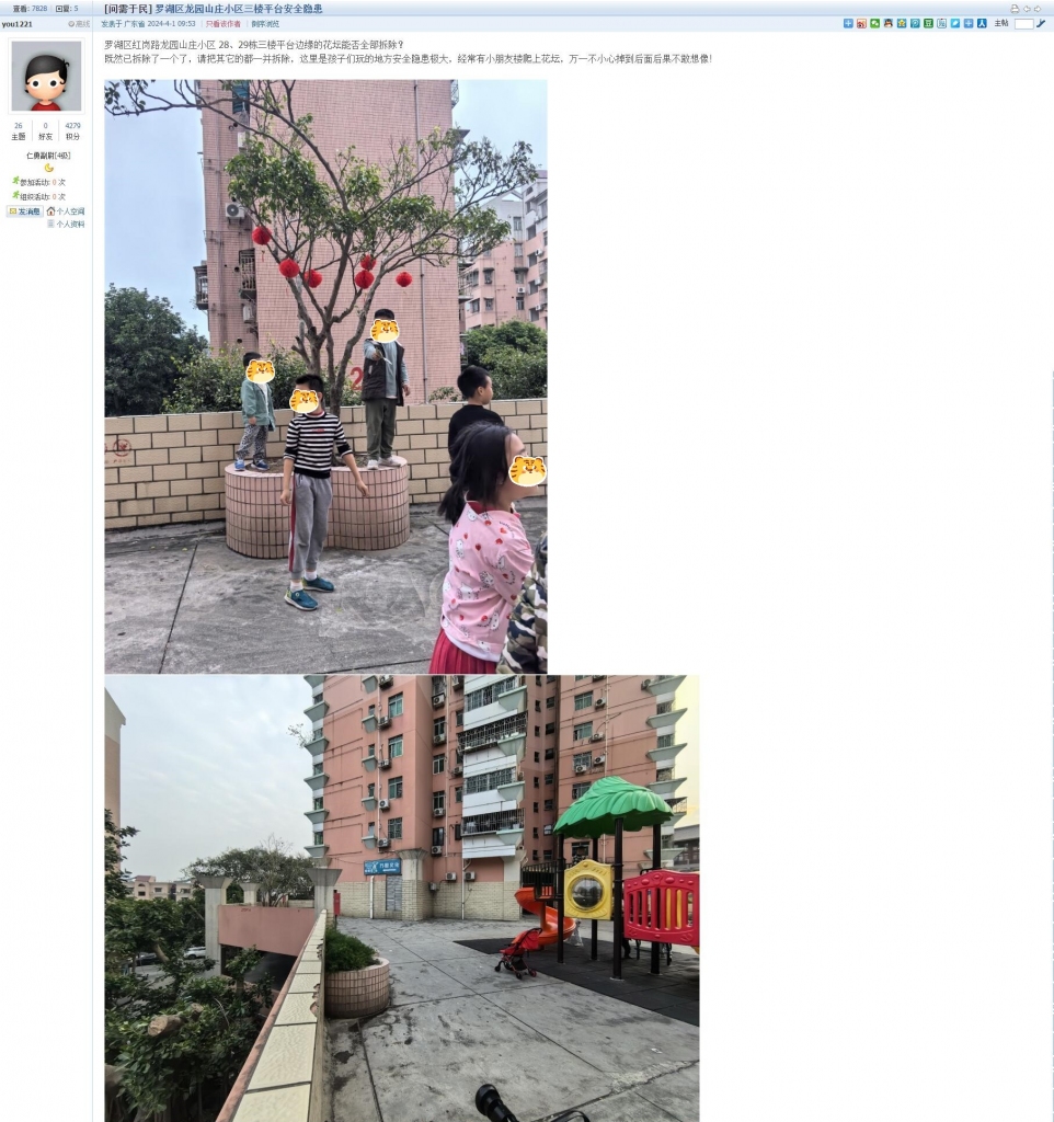 3、帖文《罗湖区龙园山庄小区三楼平台安全隐患》