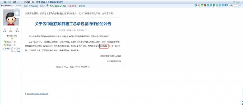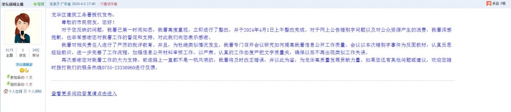 2、帖文《龙华建筑工务署官网错别字》