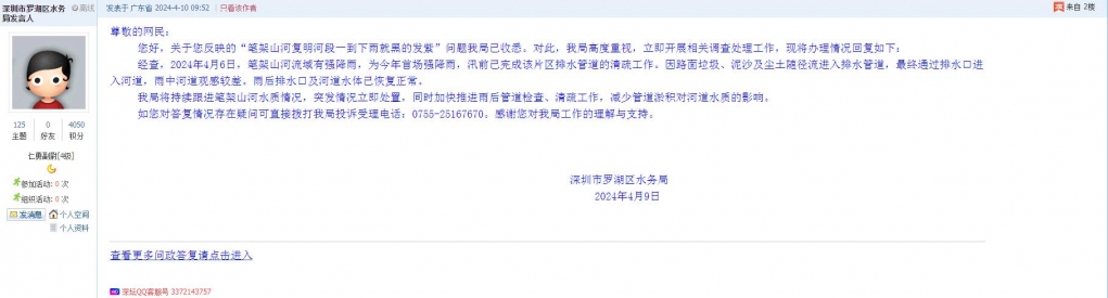 据统计,2024年4月1日-4月7日,网友在深圳论坛发布问政类帖文共41篇,得到相关单位正式回应的帖文数为25篇,回应最快的部门是罗湖区清水河街道办事处。