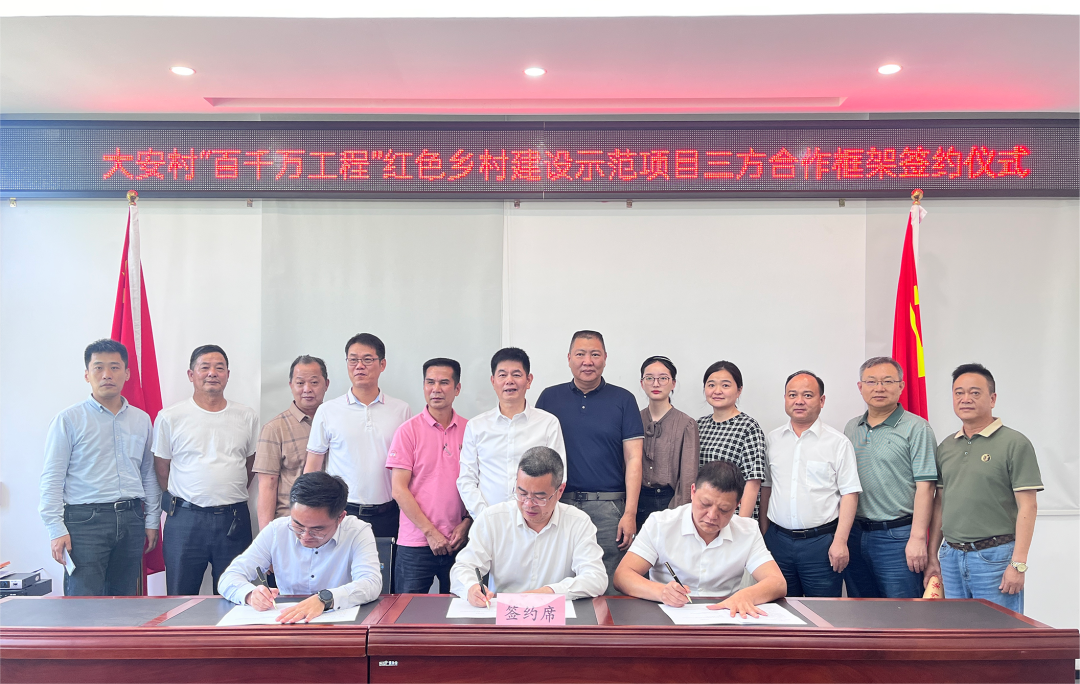 大安村背靠莲花山脉,面积90.3平方公里,上榜了中国美丽休闲乡村和中组部红色美丽村庄试点。签约项目位于塘尾、东围和榕树仔三个村民小组区域内,总面积约26万平方米,建设内容包括红色文化产业园、市民书屋、志愿者驿站、主题餐厅、亲子民宿等。同时规划建设大规模苗圃基地、绿茶种植产业园,引种高品质经济作物等。