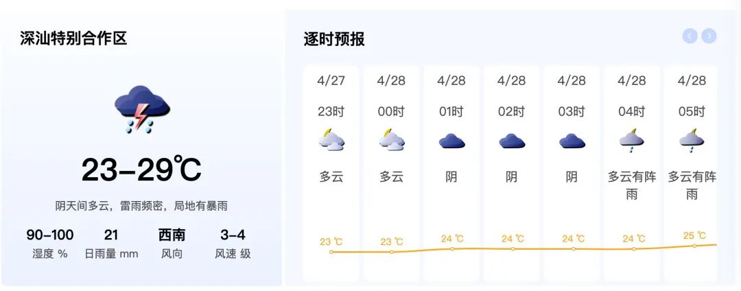 4月29日,多云间阴天,有(雷)阵雨,23-28℃;