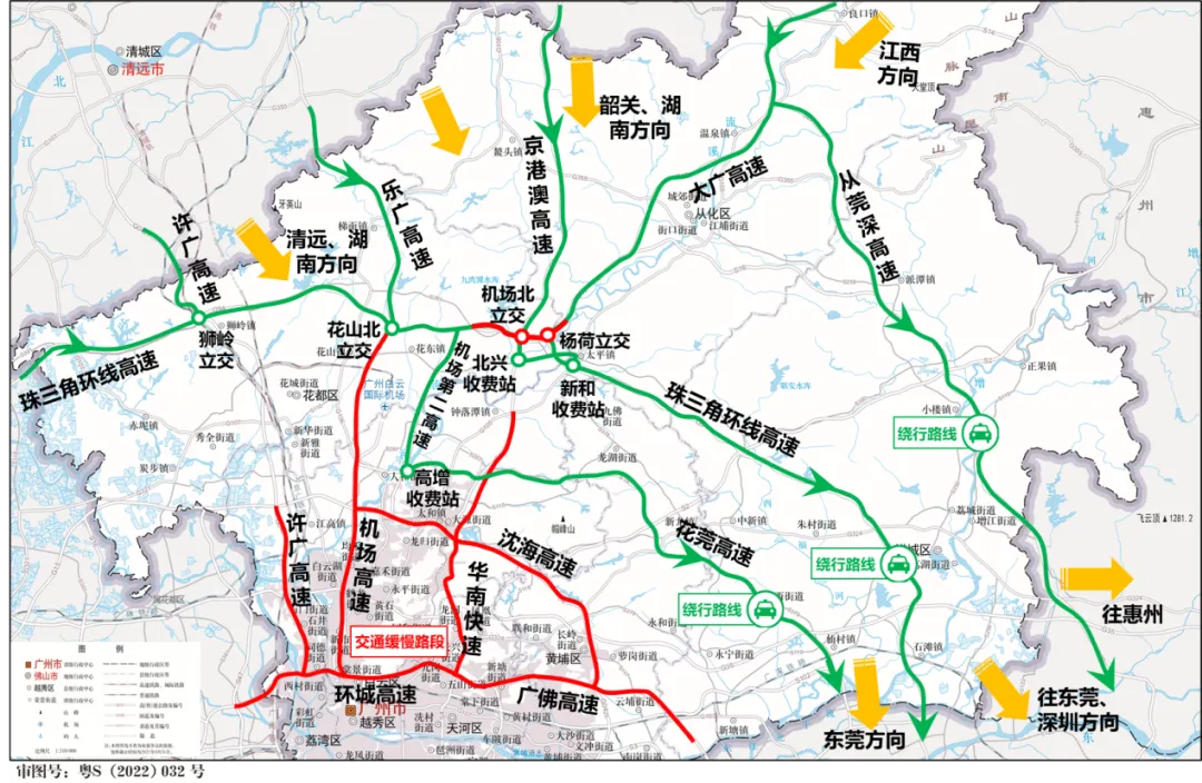 湖南、清远、韶关等北部方向来车,可通过珠三角环线(北三环)和花莞高速、从埔高速前往东莞、深圳,避开机场高速、京港澳高速、沈海高速(北二环)等拥堵路段。