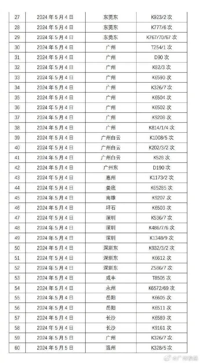据广铁集团5月3日14时通报,“五一”假日后期(3日至5日),广东粤北等地又有暴雨或大暴雨。为确保旅客列车运输安全,广铁集团将对京广铁路部分列车采取停运和限速运行等措施,途经该线路的列车将出现不同程度的晚点。由此给广大旅客带来的不便,敬请谅解。