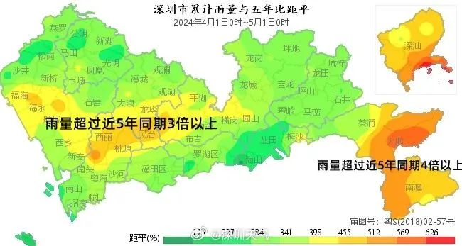刚刚过去的4月雨量偏多尤其明显,其间广东出现4次强降水过程(4月4-7日、4月16-23日、4月25-28日、4月30-5月1日)。从4月1日至30日,广东全省平均雨量497.4毫米,打破4月雨量历史纪录,较常年同期(176.8毫米)显著偏多181%。
