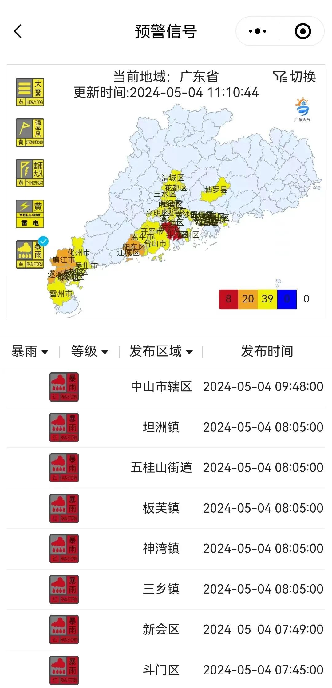 深圳市气象台2024年5月4日19时45分将深汕特别合作区、深汕海域暴雨黄色预警信号升级为橙色,全区进入暴雨防御状态。经深汕特别合作区三防指挥部决定,防汛等级升级为“Ⅳ级”。