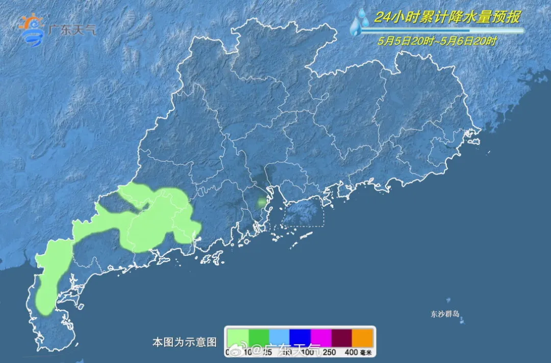 5月5日,河源、梅州、珠江三角洲北部市县多云到阴天,有中到大雨局部暴雨;其余市县多云,有(雷)阵雨。