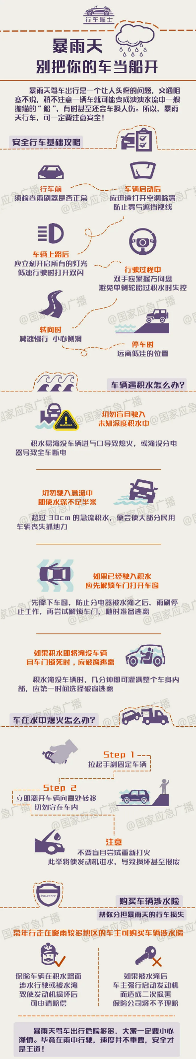 一是增强汛期安全防范意识。出发前和游玩途中要及时关注途经地和目的地最新天气预报预警和旅游提示信息,根据天气状况及时调整行程。在山区、河谷等区域要防范山体滑坡、落石、泥石流、山洪暴发等安全风险。听从当地政府及有关部门的提示和安排,及时应急避险。