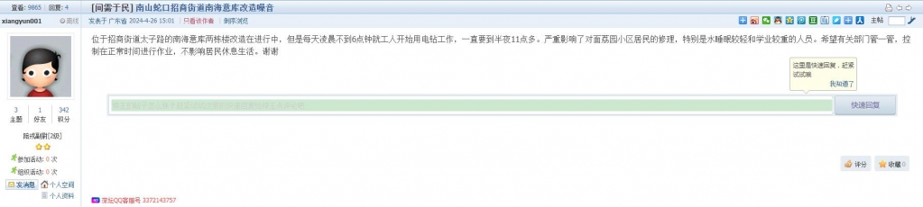3、帖文《招商锦绣观园小区通宵施工噪音扰民》