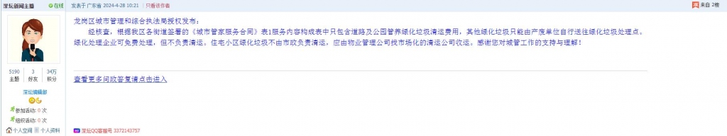 9、帖文《绿化垃圾处理问题,龙岗比较特殊,我们龙岗确实是政策洼地》