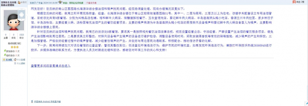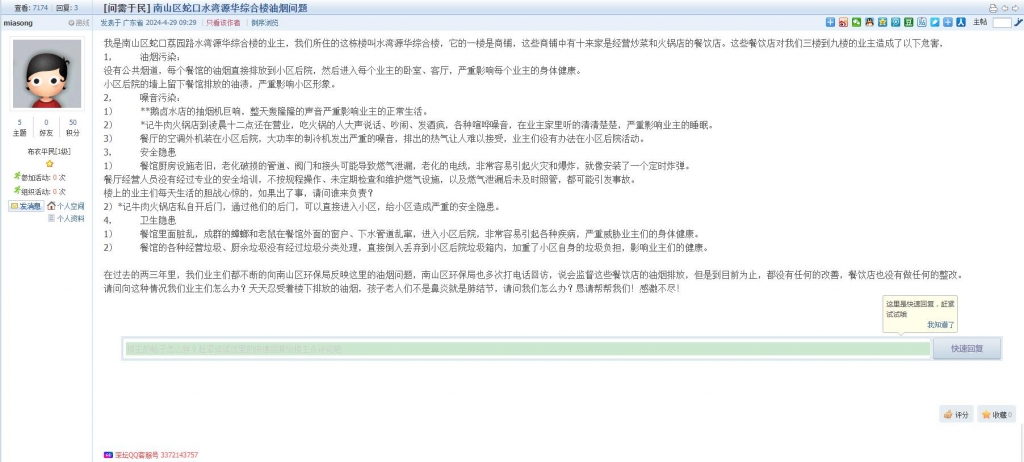 18、帖文《南山区蛇口水湾源华综合楼油烟问题》