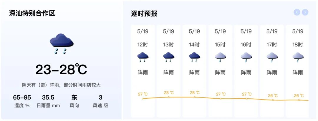 据区气象服务工作组,预计19日阴天转雷阵雨,局地雨势较大;19日夜间-21日有一次暴雨局部大暴雨降水过程;22-23日降雨减弱,有短时(雷)阵雨;展望24-25日,阴天间多云,有(雷)阵雨。