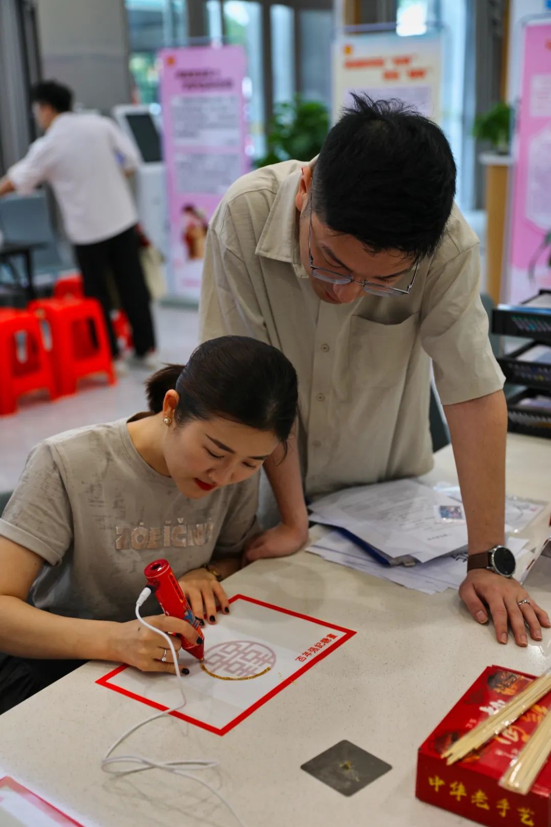 新人“莎莎”和“壮壮”亲手绘制出寓意美好的糖画,并接受来自亲友的祝福。两人还一起填写了《家务分工表》,一旁的亲友对两人的家务分工开起了玩笑,引得现场一阵大笑。“莎莎”和“壮壮”表示,在这样的日子里参与这样的活动很有意义,将会是一生中难忘的记忆。