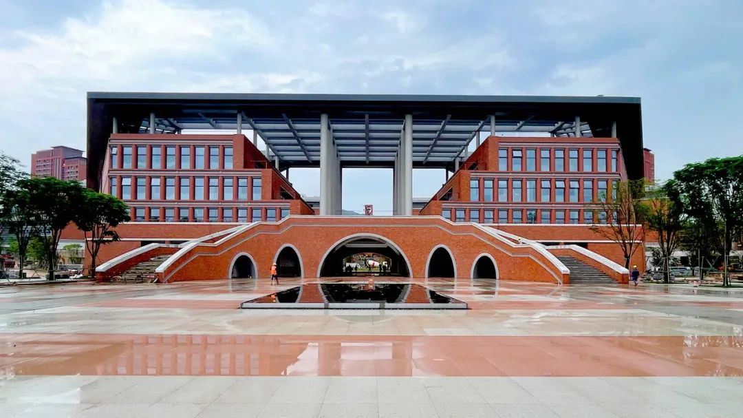 校园整体风貌体现了岭南建筑的地域性、多元性以及环境性特色。建筑造型采用中正简洁大气的建筑形态,以及骑楼、退台、绿廊等符合岭南气候特征的空间元素,为深中师生提供一个绿意盎然、依然舒适的教学生活环境。