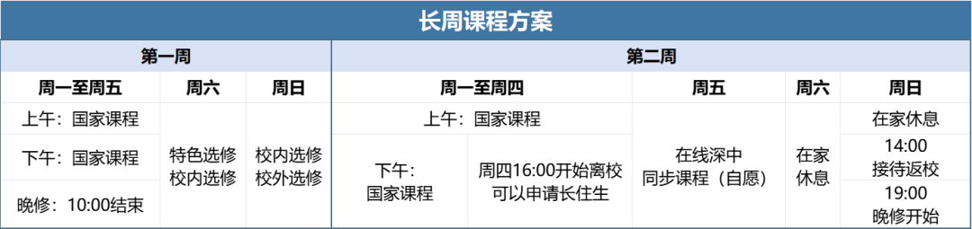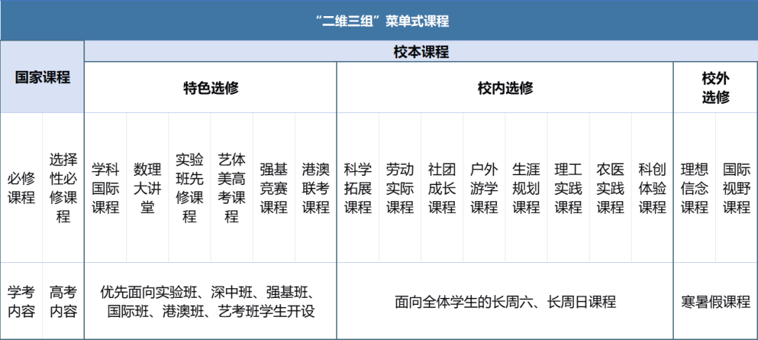 遵循深圳中学“为了促进每一位学生自由且充分的发展”课程核心价值,围绕“更有兴趣地学习、让学生更有价值地学习、更有目标地学习”学习理念,深圳中学高中园创新常规学制,提出了以终为始的“二维三组”菜单式课程、长周课程。