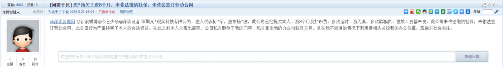 15、帖文《光*拖欠工资8个月,未依法缴纳社保,未依法签订劳动合同》