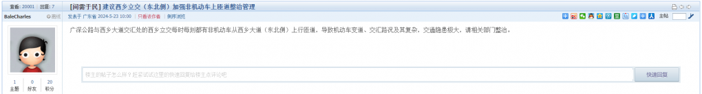 17、帖文《建议西乡立交(东北侧)加强非机动车上匝道整治管理》