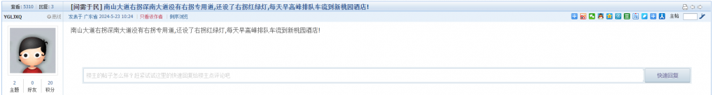 5、帖文《南山大道右拐深南大道没有右拐专用道,还设了右拐红绿灯,每天早高峰排队车流到新桃园酒店!》