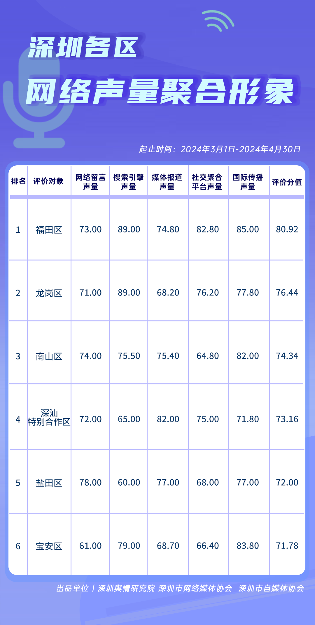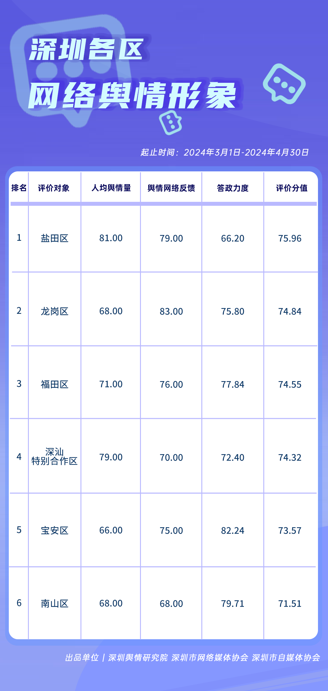 为全面评估深圳各区各单位网络形象建设情况,助力各区各单位持续响应居民对美好生活的期许,赋能城市高质量发展,深圳舆情研究院、深圳市网络媒体协会、深圳市自媒体协会联合推出“深圳各区各单位网络形象建设榜”,从网络聚合声量、留言互动成效、社会生活评价、舆情管理能力及新媒体传播水平等方面,多维度分析深圳各区(含大鹏新区、深汕特别合作区)、各市直单位(市直属单位、直属部门)的网络形象建设成果,凸显各区各单位的“共性”与“个性”。
