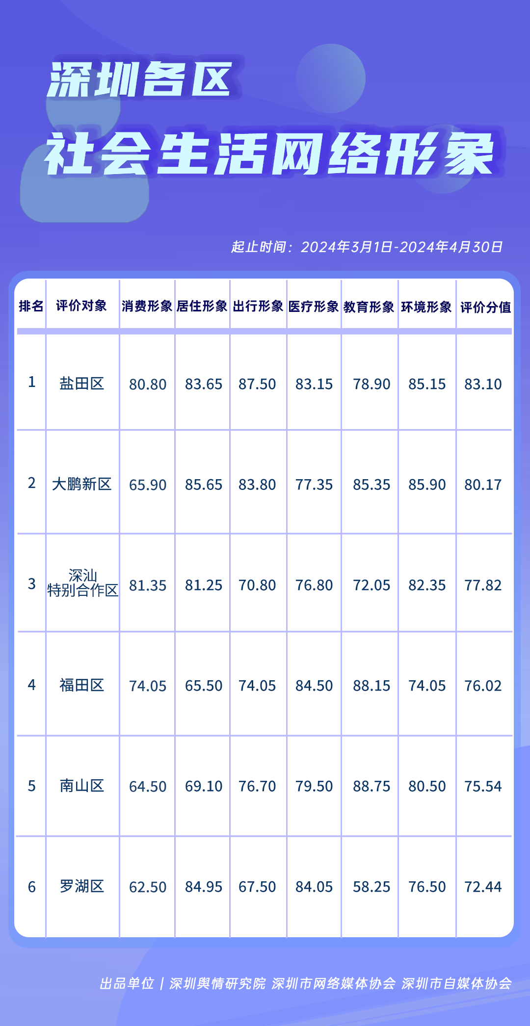 《深圳各区网络形象建设榜》从深圳各区的网络声量聚合形象(100分)、社会生活网络形象(100分)、新媒体传播形象(100分)、网络舆情形象(100分)四个维度展开综合评价、计分排名,最终形成榜单。