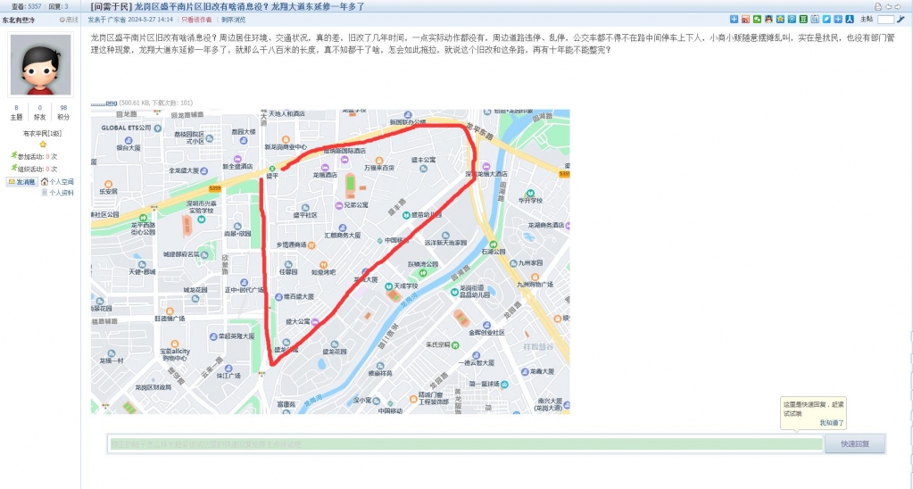 2、帖文《龙岗区盛平南片区旧改有啥消息没?龙翔大道东延修一年多了》