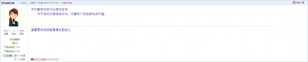 据统计,2024年5月27日-6月2日,网友在深圳论坛发布问政类帖文共37篇,得到相关单位正式回应的帖文数为17篇,罗湖区回应率最高,回复最快的部门是市交警局龙岗大队。