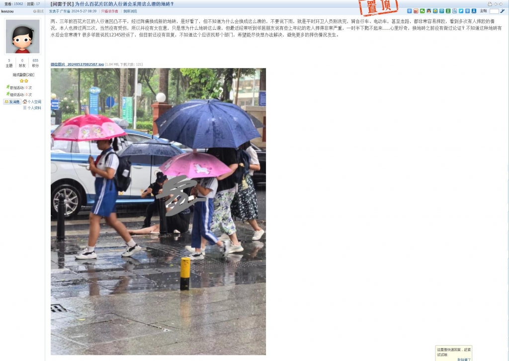 1、帖文《为什么百花片区的人行道会采用这么滑的地砖?》