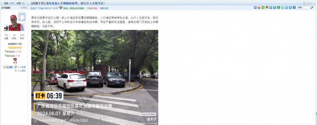 12、帖文《请在此加上车辆隔离桩吧,别让行人无路可走!》