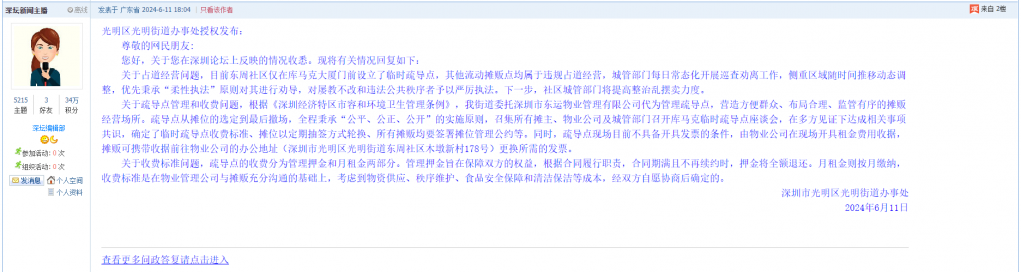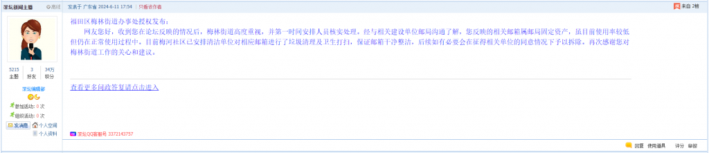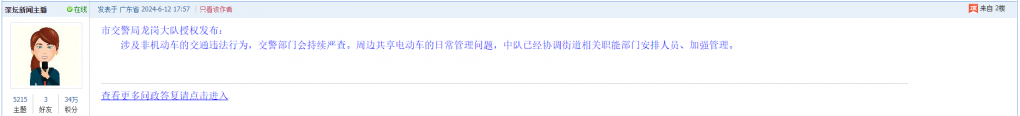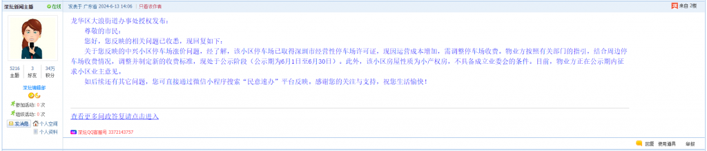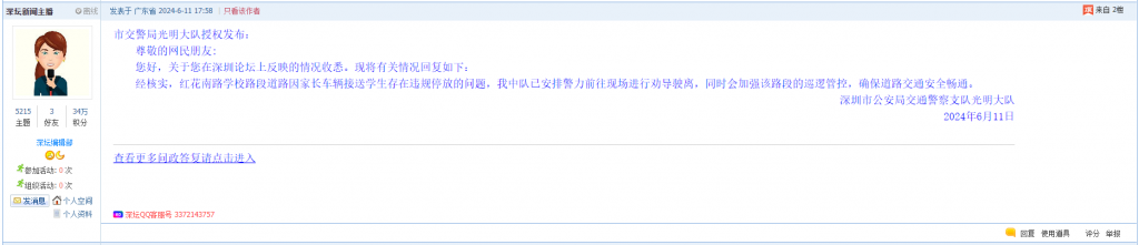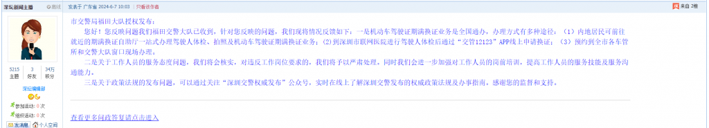 各职能单位如需对网友反映的问题进行回应,可在深圳论坛注册官方账号并通过认证,回帖进行回应。