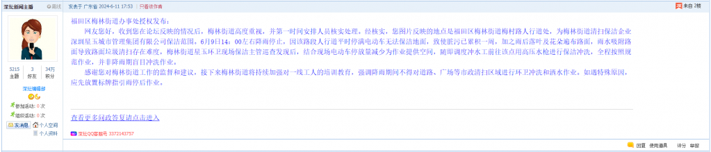 网友您好,收到您在论坛反映的情况后,梅林街道高度重视,并第一时间安排人员核实处理。经核实,您图片反映的地点是福田区梅林街道梅村路人行道处,为梅林街道清扫保洁企业深圳星玉城市管理集团有限公司保洁范围。6月9日14:00左右降雨停止,因该路段人行道平时停满电动车无法保洁地面,致使脏污已累积一周,加之雨后落叶及花朵遍布路面,雨水吸附路面导致路面垃圾清扫存在难度,梅林街道星玉环卫现场保洁主管巡查发现后,结合现场电动车停放量减少为作业提供空间,随即调度冲水工前往该点用高压水枪进行保洁冲洗,全程按照规范作业,并非降雨期盲目冲洗作业。感谢您对梅林街道工作的监督和建议,接下来梅林街道将持续加强对一线工人的培训教育,强调降雨期间不得对道路、广场等市政清扫区域进行环卫冲洗和洒水作业。如遇特殊原因,应先放置标牌指引雨停后作业。