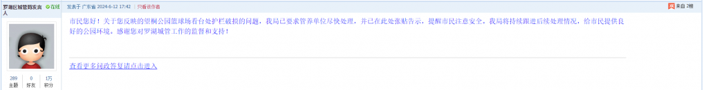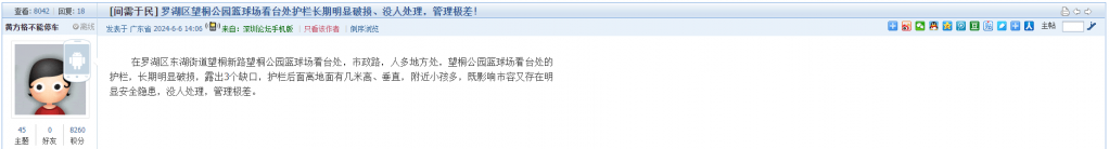 10、帖文《罗湖区望桐公园篮球场看台处护栏长期明显破损、没人处理,管理极差!》
