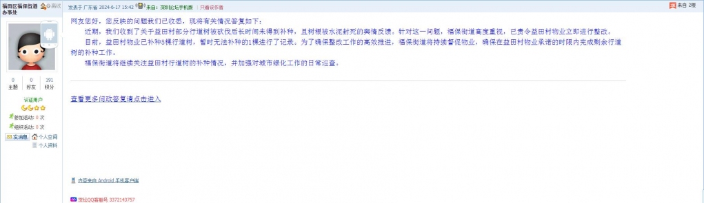 目前,益田村物业已补种5棵行道树,暂时无法补种的1棵进行了记录。为了确保整改工作的高效推进,福保街道将持续督促物业,确保在益田村物业承诺的时限内完成剩余行道树的补种工作。